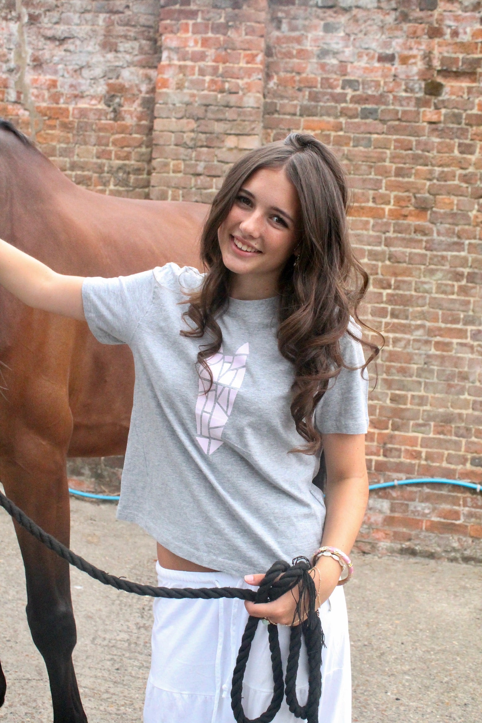 Our icon tee is a wardrobe staple, long cropped to hang just at the waistline creating a trendy silhouette. This tee looks great with your riding leggings, or any leggings, or we also love it with jeans to add equine flair to the everyday wardrobe.